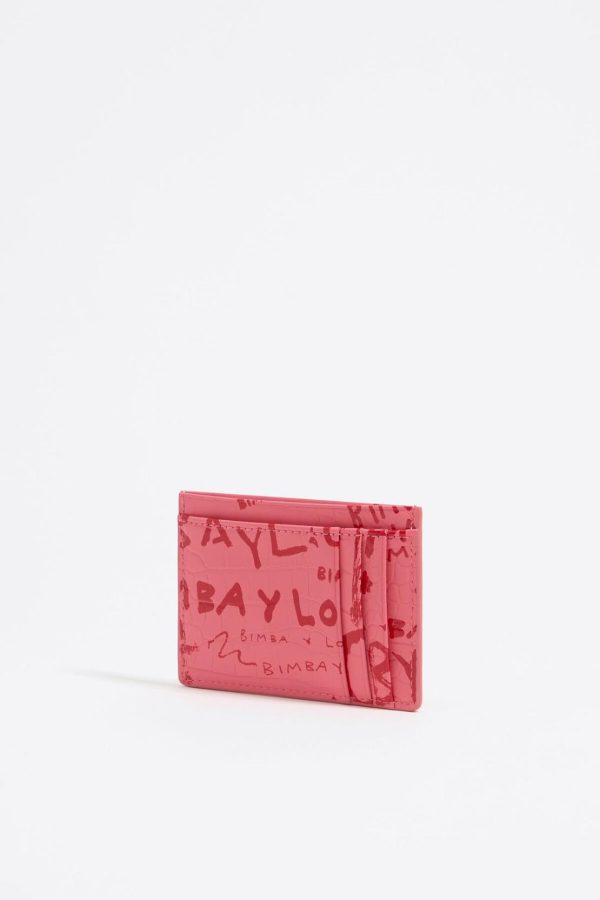 Mock croc card holder with BIMBAYLOLA.COM print on a pink background. Exterior customized with metallic logo.
