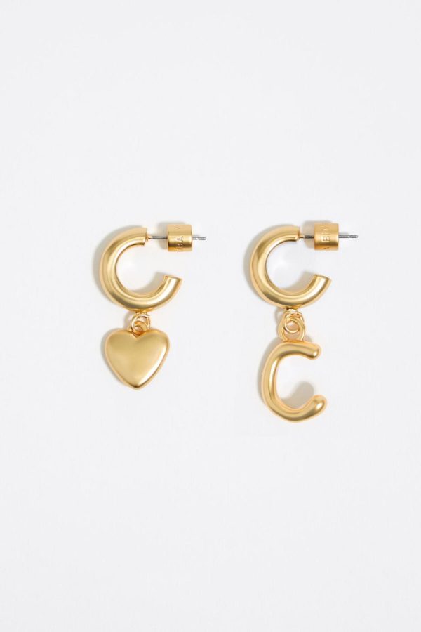 Gold tone metal hoop earrings with heart and letter C pendant. Model customized with engraved logo.