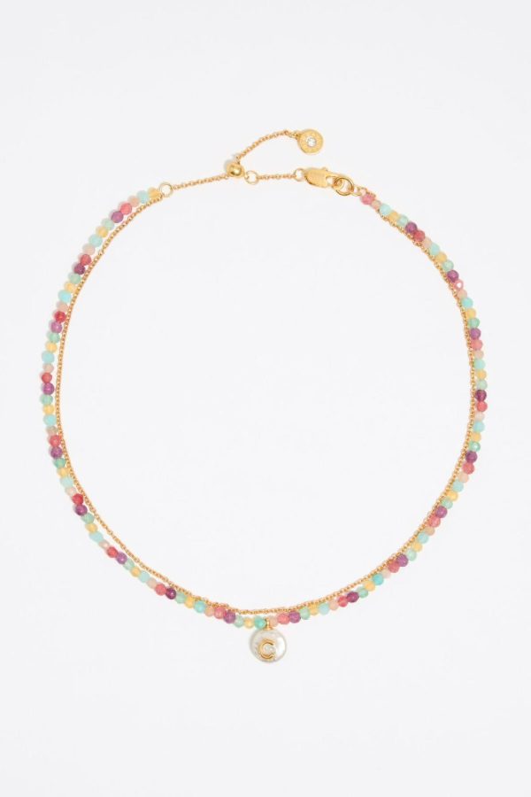 Necklace with multicolor stones and pearl with letter C. Model customized with engraved logo.