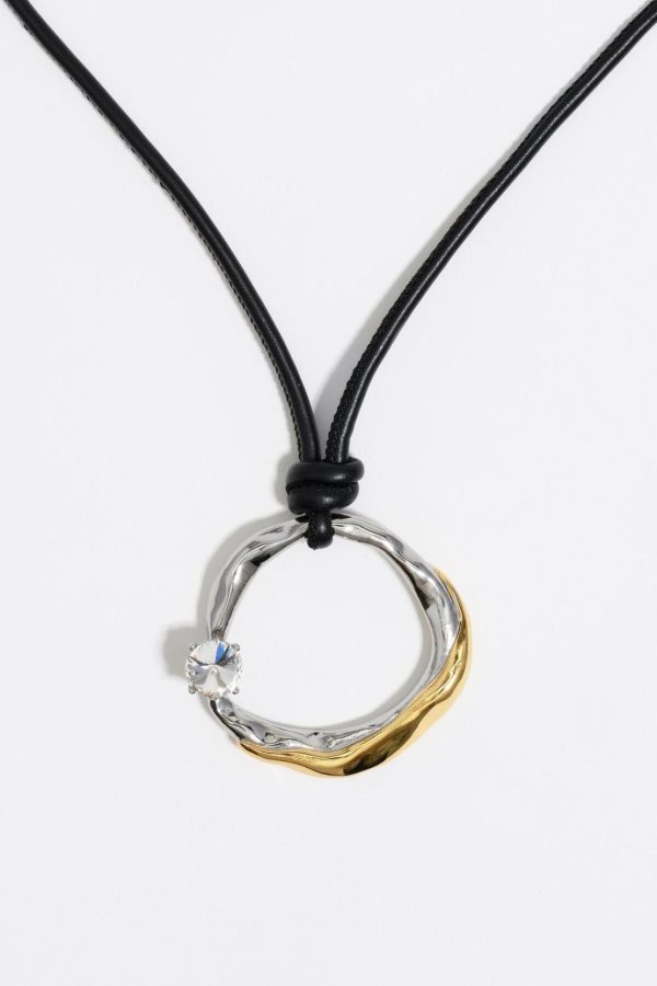 Necklace with black cord and textured hoop.