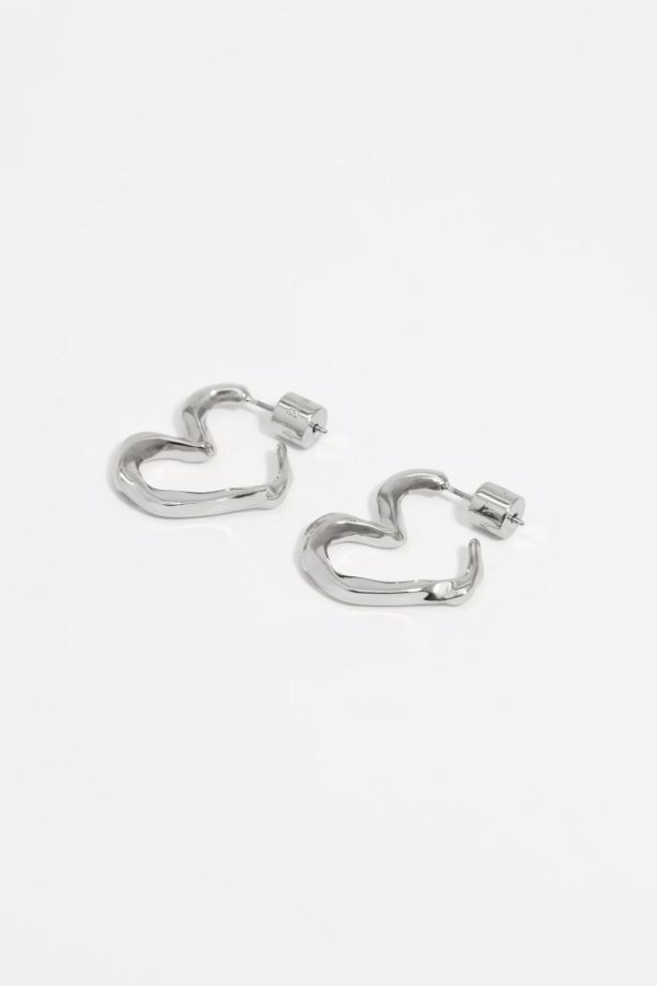 Heart-shaped textured silver metal hoop earrings. Model customized with engraved logo.