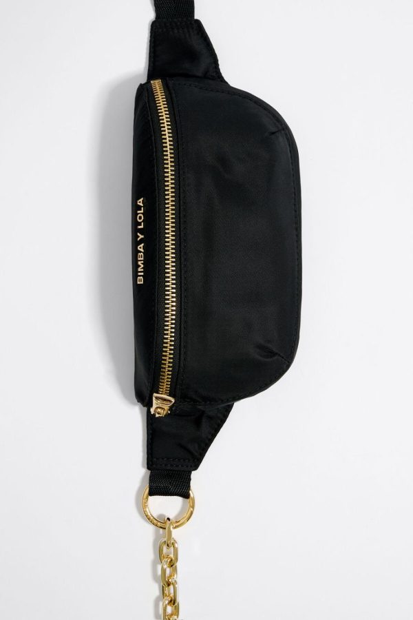 Nylon bumbag in black. Model with zip fastener, fabric strap and chain strap. Interior card holder and exterior customized with metal logo.