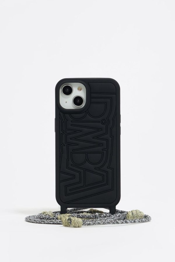 Silicone iPhone 15 case in black. Model with adjustable neck strap.
