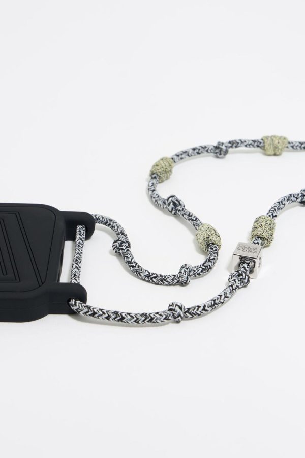Silicone iPhone 16 Pro Max case in black. Model with adjustable neck strap.