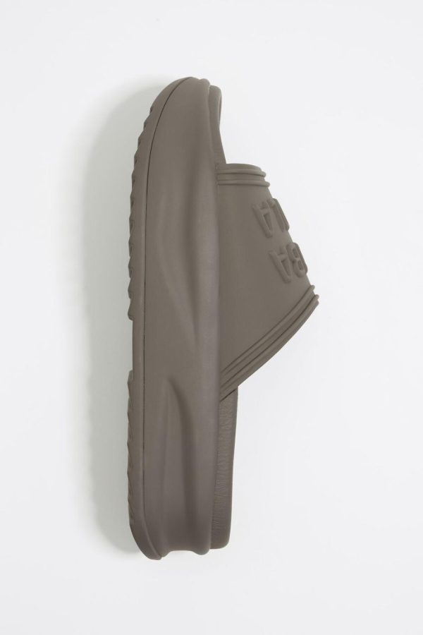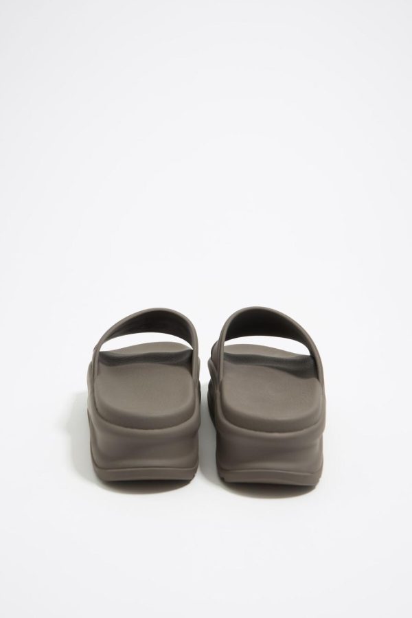 Platform slider with organic lines in khaki. Model with logo strap. Logo sole with serrated finish.