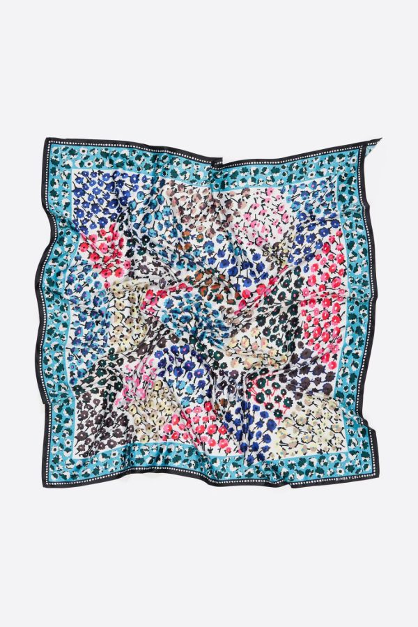 Scarf with groups of multicolor floral prints and light blue border.