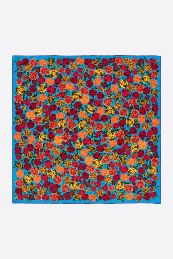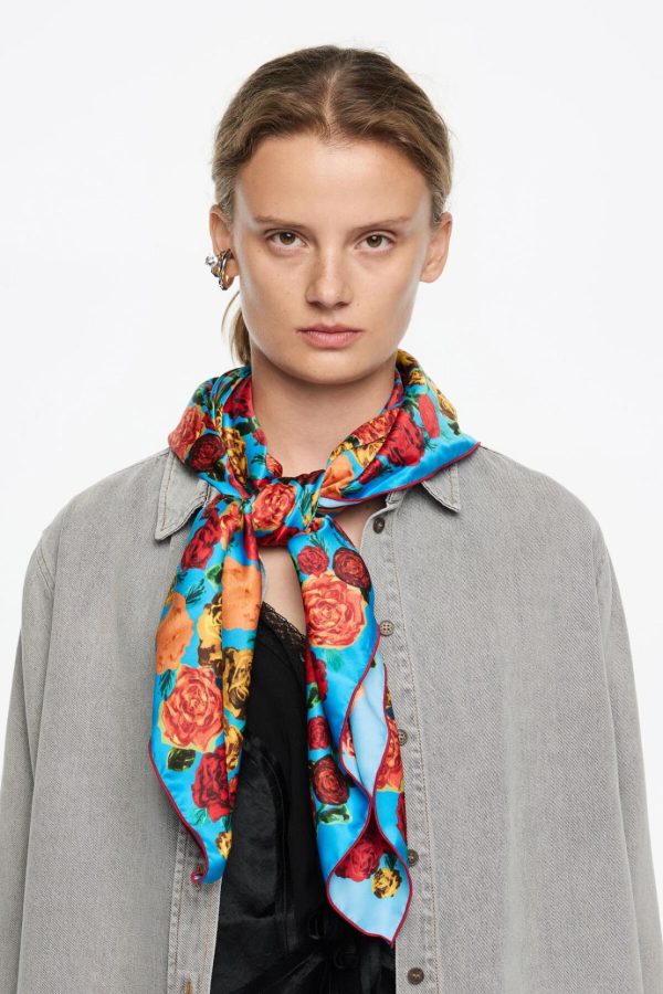 Scarf with roses print on a blue background. 100% Recycled polyester.