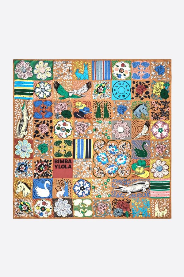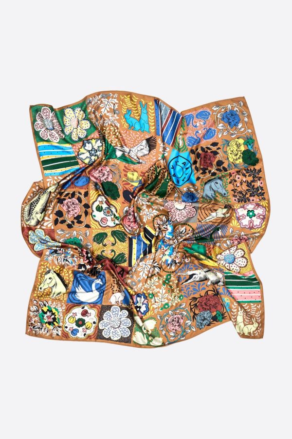 Scarf with mosaic print on a camel background. 100% Recycled polyester.