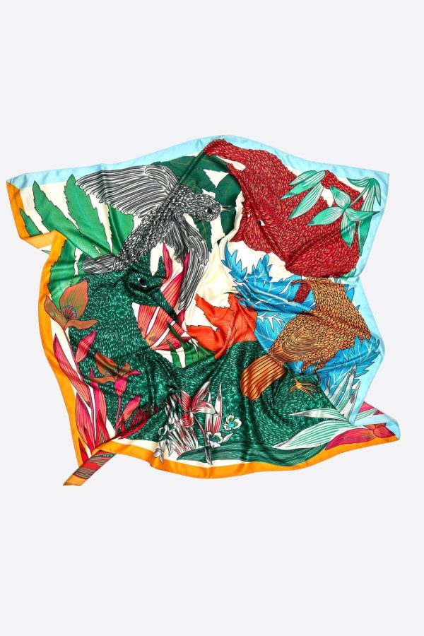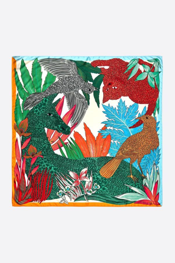 Scarf with animals and tropical plants print on a green background. 100% Recycled polyester.