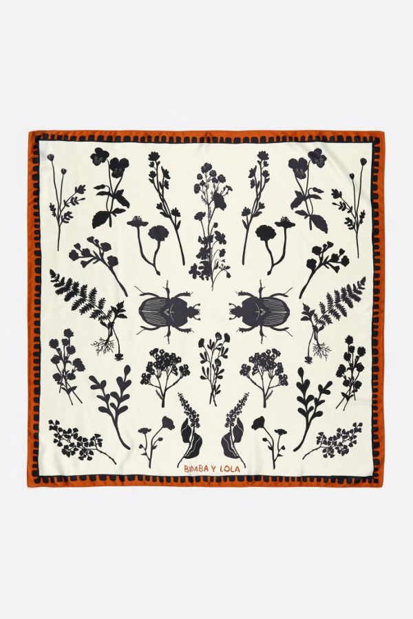 Scarf with beetles and flowers silhouette print on an off-white background. 100% Recycled polyester.