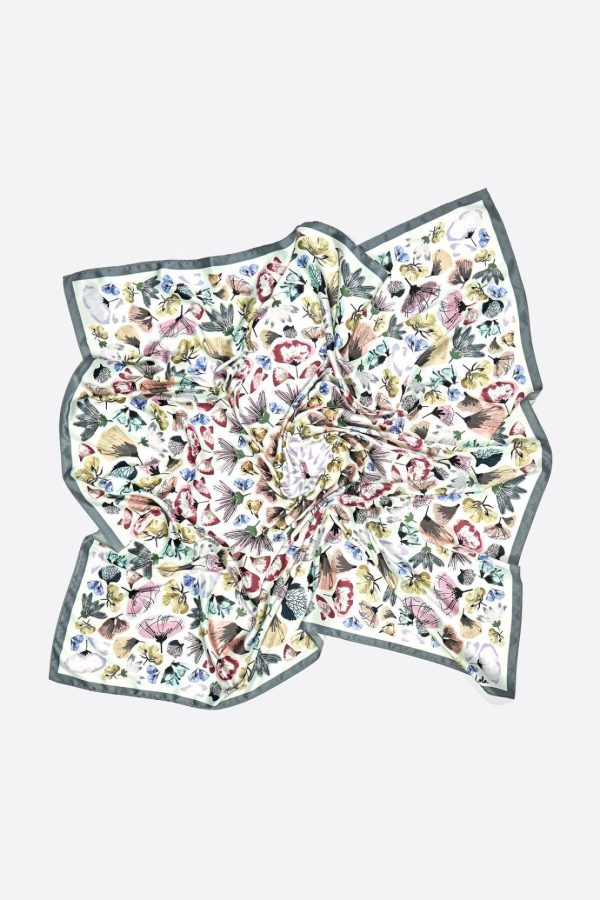 Scarf with kaleidoscopic flowers print on a pastel color background. 100% Recycled polyester.