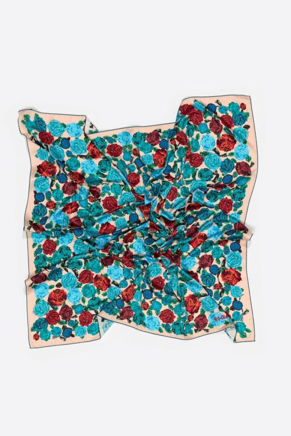 Scarf with roses print on a turquoise background. 100% Recycled polyester.