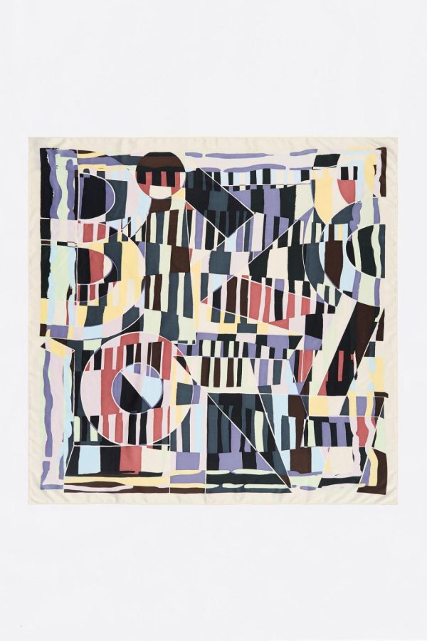 Scarf with geometric print and logo on an off-white background. 100% Recycled polyester.
